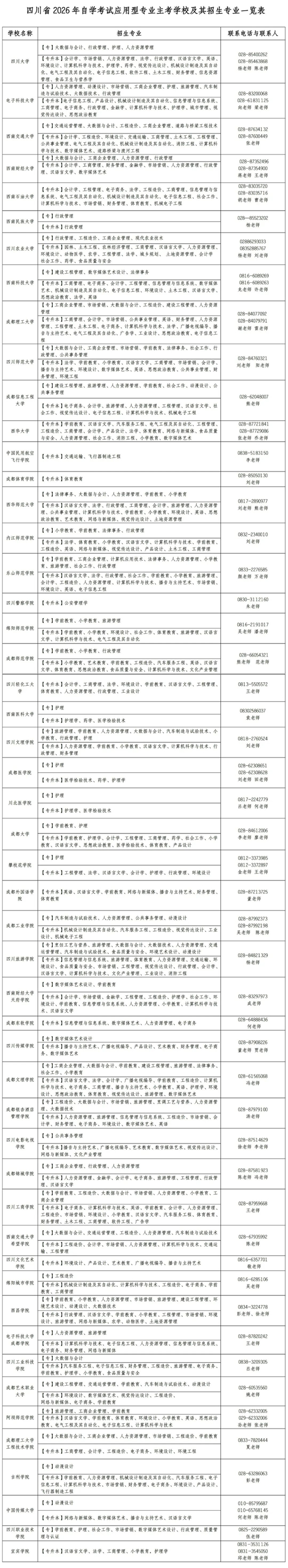 自學考試是我國高等教育的重要組成部分,是個人自學、社會助學和國家考試相結合的高等教育形式。為促進自學考試持續健康發展,省招考委、教育廳同意四川大學等50所高等學校為我省2026年高等教育自學考試應用型專業的主考學校,并開展自學考試助學工作,現將有關高等學校、主考專業及相關情況通告如下: