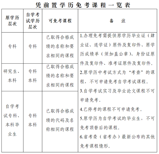 國家承認學歷的各類高等學校及自學考試專科以上(含專科)的畢業生(肄業生、退學生)報考自學考試,可按有關規定申請免考已學過并考試成績合格的有關課程。本科結業可視同專科學歷,可使用結業的合格成績辦理專科層次課程的免考。