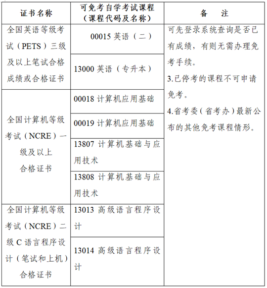 根據有關規定,目前可申請免考自學考試課程的證書包括學歷證書和全國計算機等級考試(NCRE)、全國英語等級考試(PETS)、大學英語四六級考試(CET)的相關等級證書。