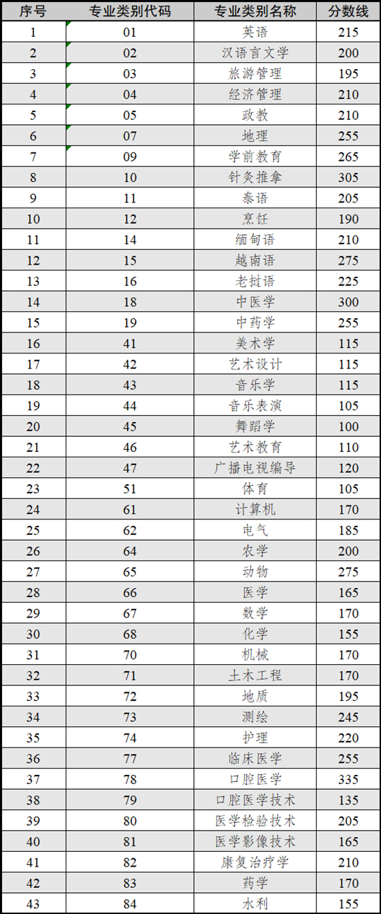 云南省2025年普通高校專升本各專業類別最低錄取控制分數線