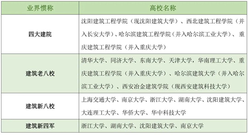 經過長期的發展,我們耳熟能詳的“四大建院”“建筑老八校”等高校都是建筑領域有名的學校!八拇蠼ㄔ骸笔1960年原建設部(現住房和城鄉建設部)直屬的七所建筑高校中實力最強的四所,被稱作“四大建院”,現均已合并或改名!敖ㄖ习诵!笔禽^早開設建筑學相關專業、在行業內擁有重大影響力的高校。此外,還有被喻為“建筑新八!薄敖ㄖ滤能姟钡雀咝R彩侨珖ㄖ愄厣盒。具體詳見下表。