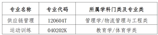 根據(jù)《教育部高等教育司關(guān)于開展2025年度普通高等學(xué)校本科專業(yè)設(shè)置工作的通知》(教高司函〔2025〕3號(hào))《關(guān)于開展2025年度普通高等學(xué)校本科專業(yè)設(shè)置工作的通知》(津教高函〔2025〕20號(hào))等文件要求,我校開展了2025年度擬增設(shè)專業(yè)申報(bào)工作。經(jīng)學(xué)院申請(qǐng)、校內(nèi)外專家評(píng)議、校長辦公會(huì)審議通過,擬增設(shè)供應(yīng)鏈管理專業(yè)、運(yùn)動(dòng)訓(xùn)練專業(yè)。