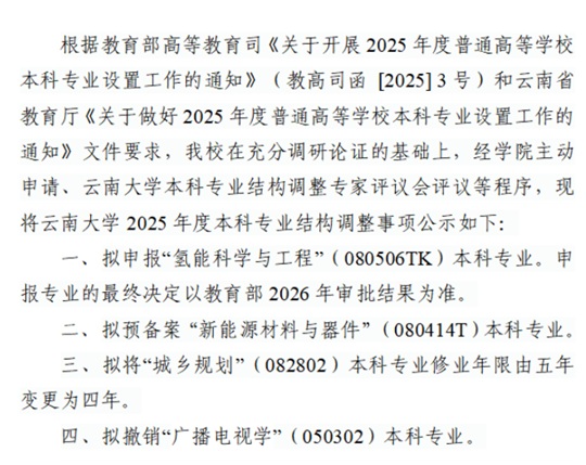 云南大學(xué)2025年度本科專業(yè)擬調(diào)整事項(xiàng)